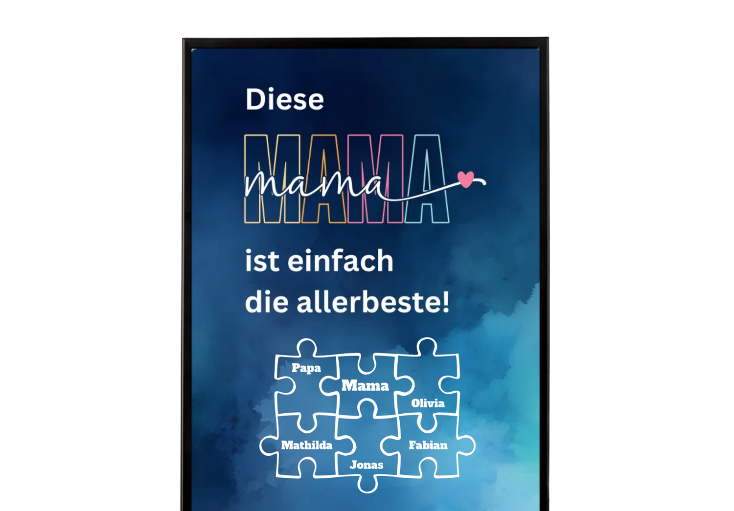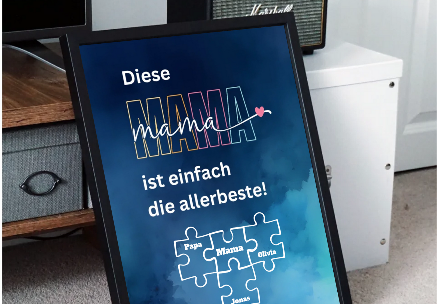 Das Highlight dieses Posters ist das personalisierte Puzzle-Motiv: Jedes Teil steht für ein Familienmitglied – und in der Mitte ist Mama, die alles zusammenhält. Du kannst bis zu 4 Namen angeben, die wir individuell in die Puzzlestücke einfügen. So entsteht ein einzigartiges Kunstwerk, das zeigt, was Familie wirklich bedeutet.