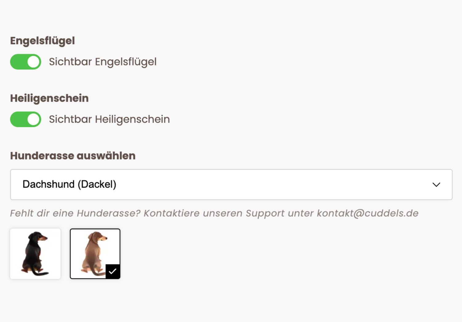 Sollte die von die benötigte Hunderasse nicht aufgelistet sein kannst du unseren Support unter kontakt@cuddels.de kontaktieren - sehr gerne hilft dir das Team dabei weiter